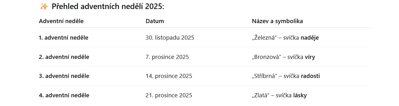Zítra máme výjimečnou první adventní neděli, protože letos začíná advent nezvykle brzy – už v listopadu. A s ní se do našich domovů vrací i adventní věnec, symbol očekávání a naděje. Jeho kruh bez začátku a konce připomíná věčnost, zelené větvičky život uprostřed zimy a čtyři svíce světlo, které postupně roste s každou nedělí. Když se zítra rozhoří ta první, přinese nejen teplo do místnosti, ale i klid do duše – první plamínek naděje v čase, kdy světlo začíná znovu vítězit nad tmou.