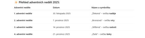 V roce 2025 začne advent v neděli 30. listopadu, tedy právě v den svátku svatého Ondřeje, a potrvá čtyři týdny – až do Štědrého dne, středy 24. prosince.