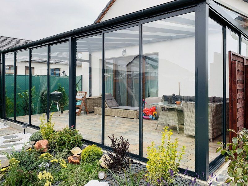 - Zimní zahrada je obytným prostorem i v chladných měsících, což klade důraz na flexibilitu stínění.